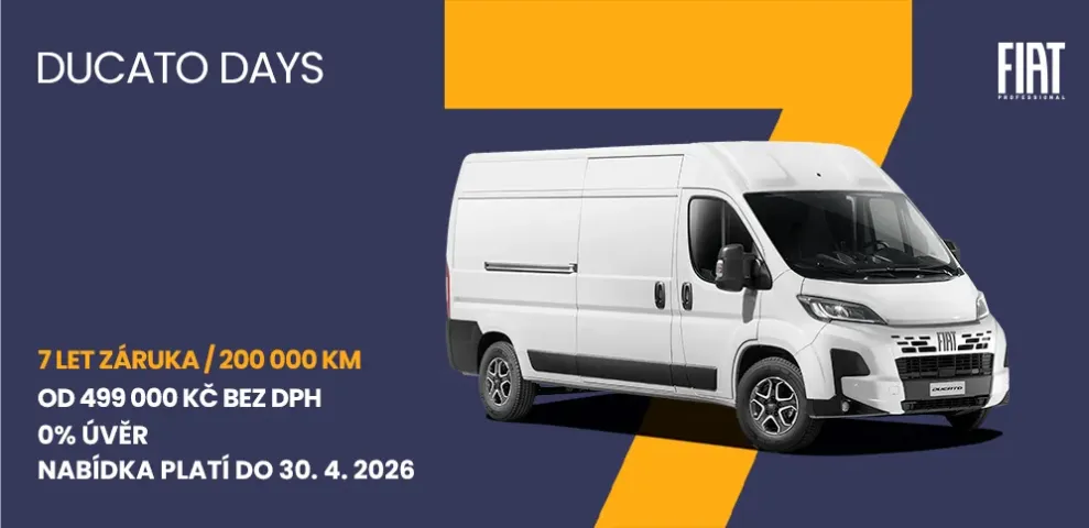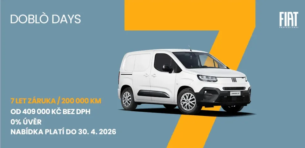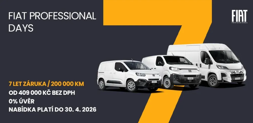 Využijte jedinečnou nabídku značky Fiat Professional. Fiat Professional Days přinášejí atraktivní cenu užitkových vozů od 409 000 Kč bez DPH, výhodné financování s 0% úvěrem a navíc 7letou záruku (200 000 km) na vozy zakoupené v rámci akce.