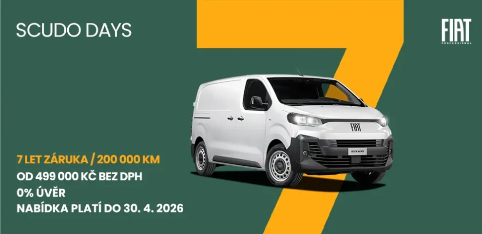 Fiat Scudo je v nabídce s akční cenou již od 499 000 Kč bez DPH. Scudo nabízí naftové motory o výkonu až 180 koní, nebo možnost volby elektrického pohonu, který splňuje potřeby moderního podnikání. Robustní a variabilní konstrukce se snoubí s komfortní jízdou podobnou osobnímu vozu. Nákladový prostor nabízí až 6,6 m³ a užitečné zatížení až 1,2 t, přičemž praktické prvky jako sklopné sedadlo Magic Cargo zvyšují flexibilitu při přepravě dlouhých předmětů. Díky kompaktním rozměrům a výšce pouhých 190 cm je Scudo ideální pro pohyb ve městě, a moderní asistenční systémy zajišťují bezpečnost a pohodlí při každé jízdě.